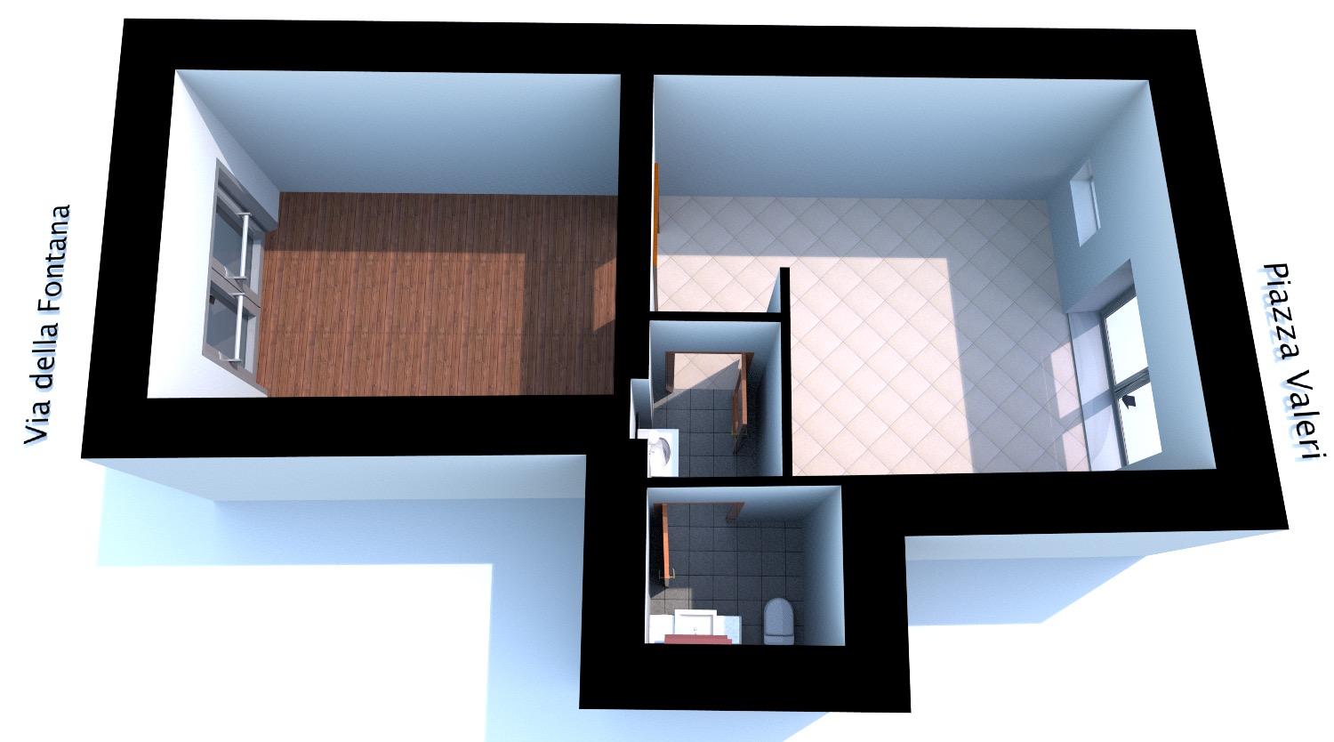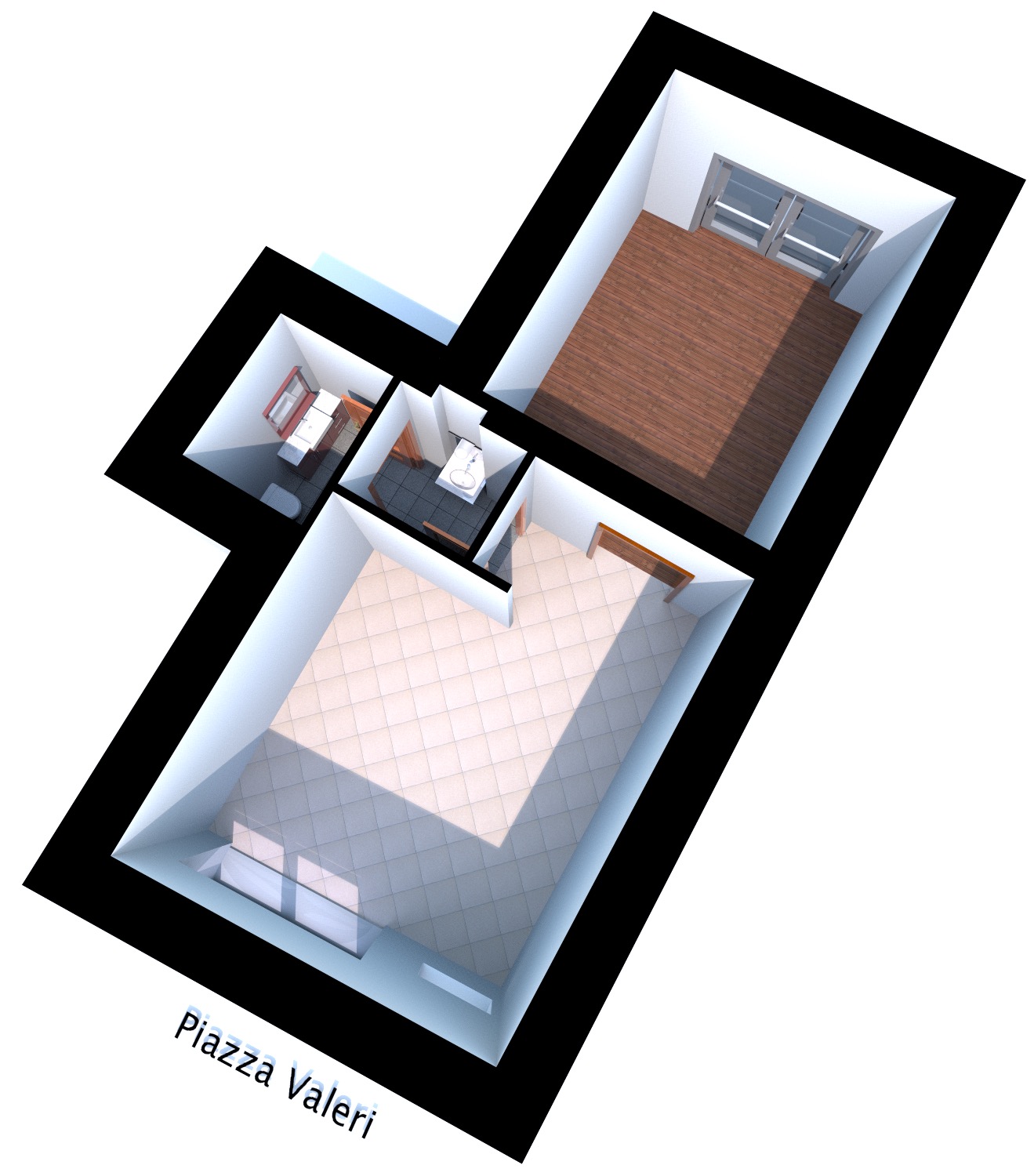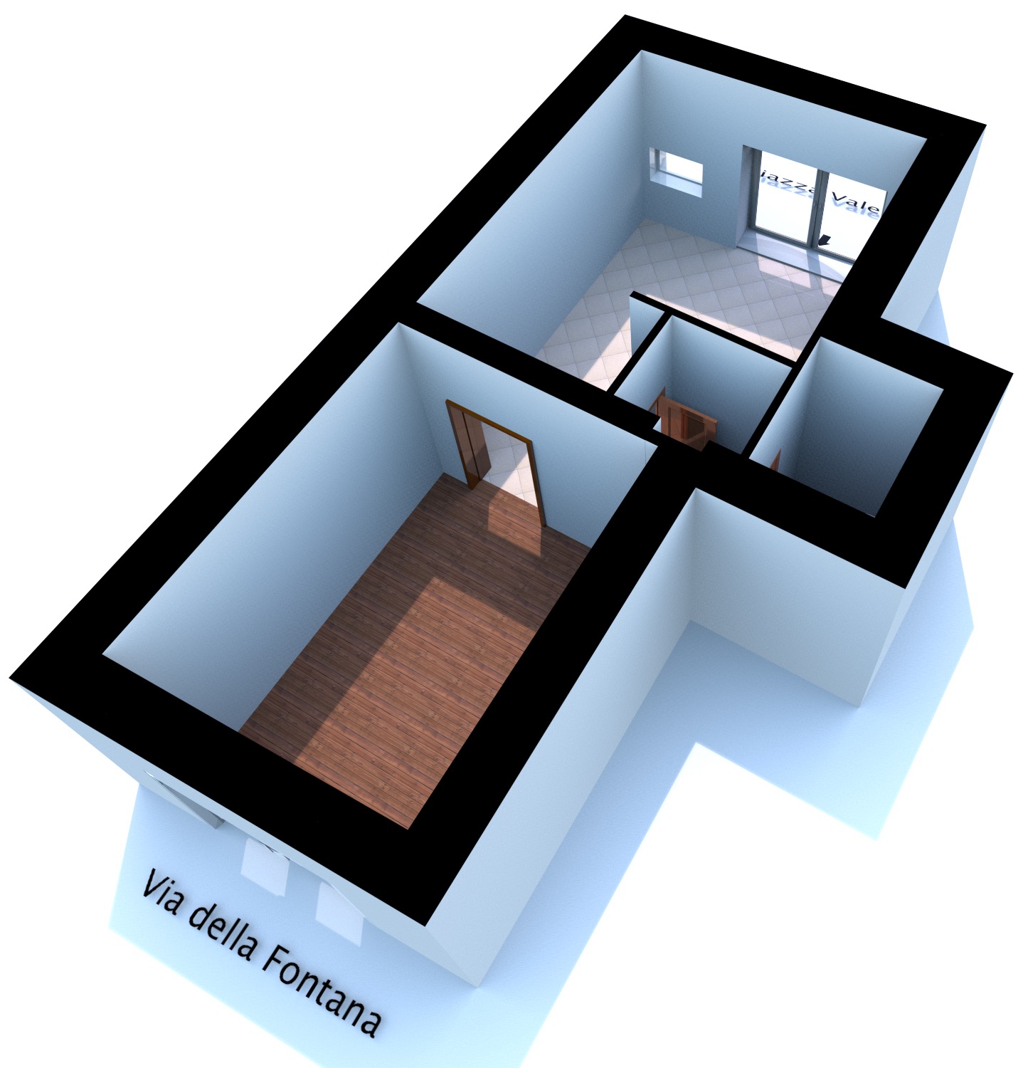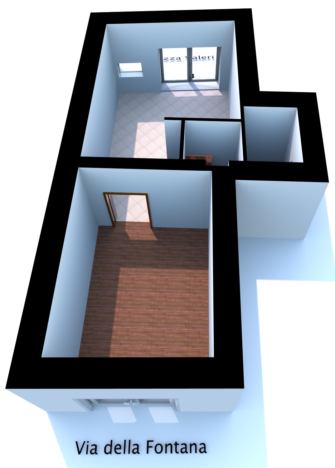 L’ingresso su Piazza Valeri ha anche una doppia porta/vetrata di accesso che crea un piccolo disimpegno.