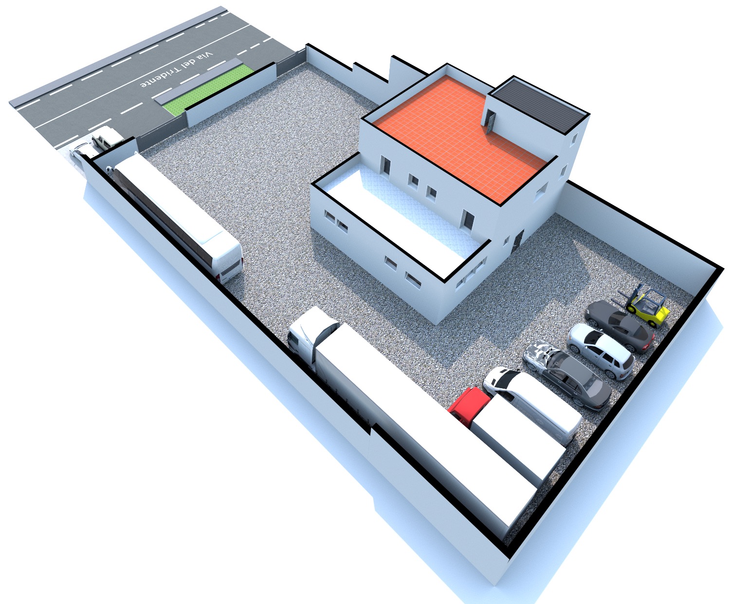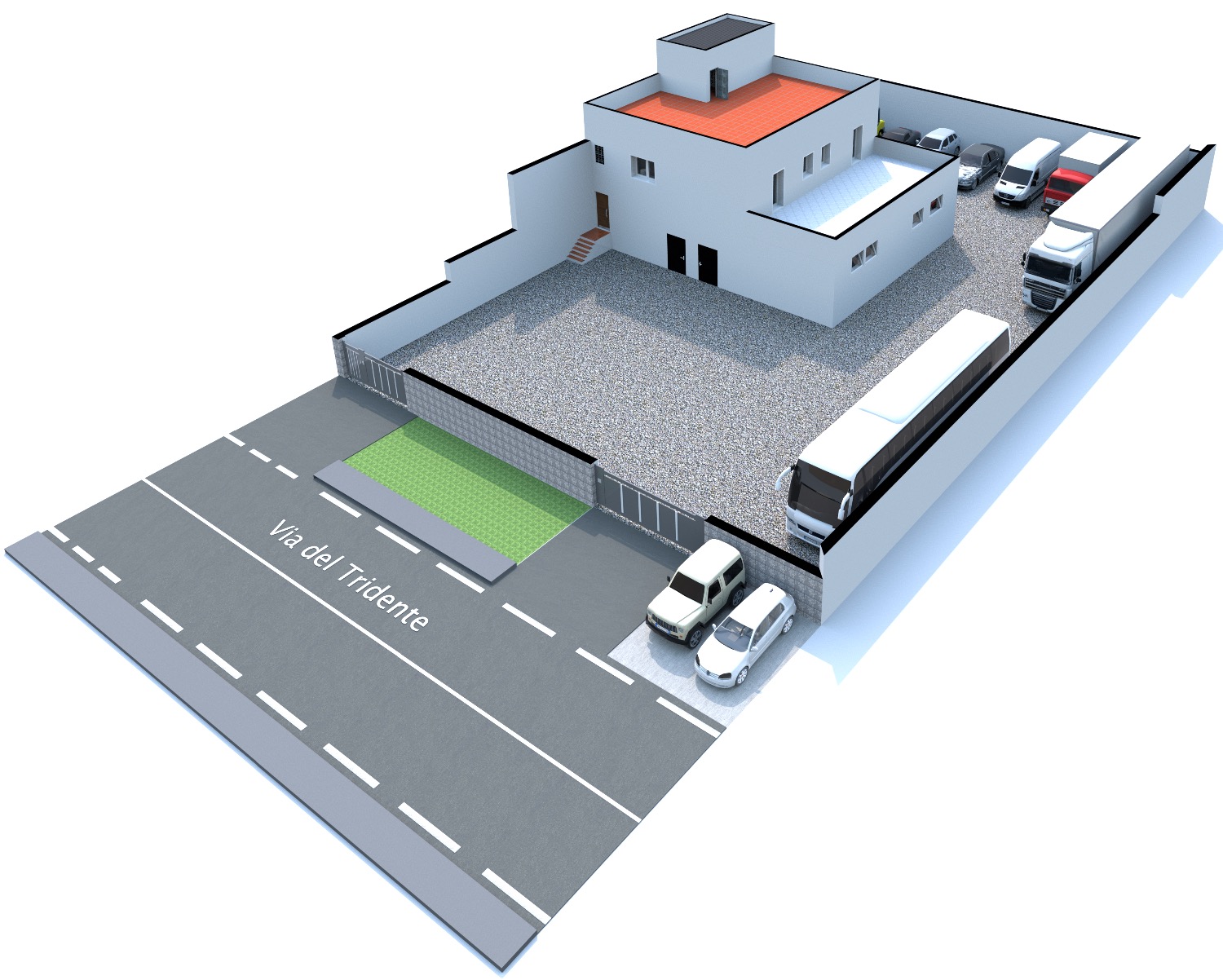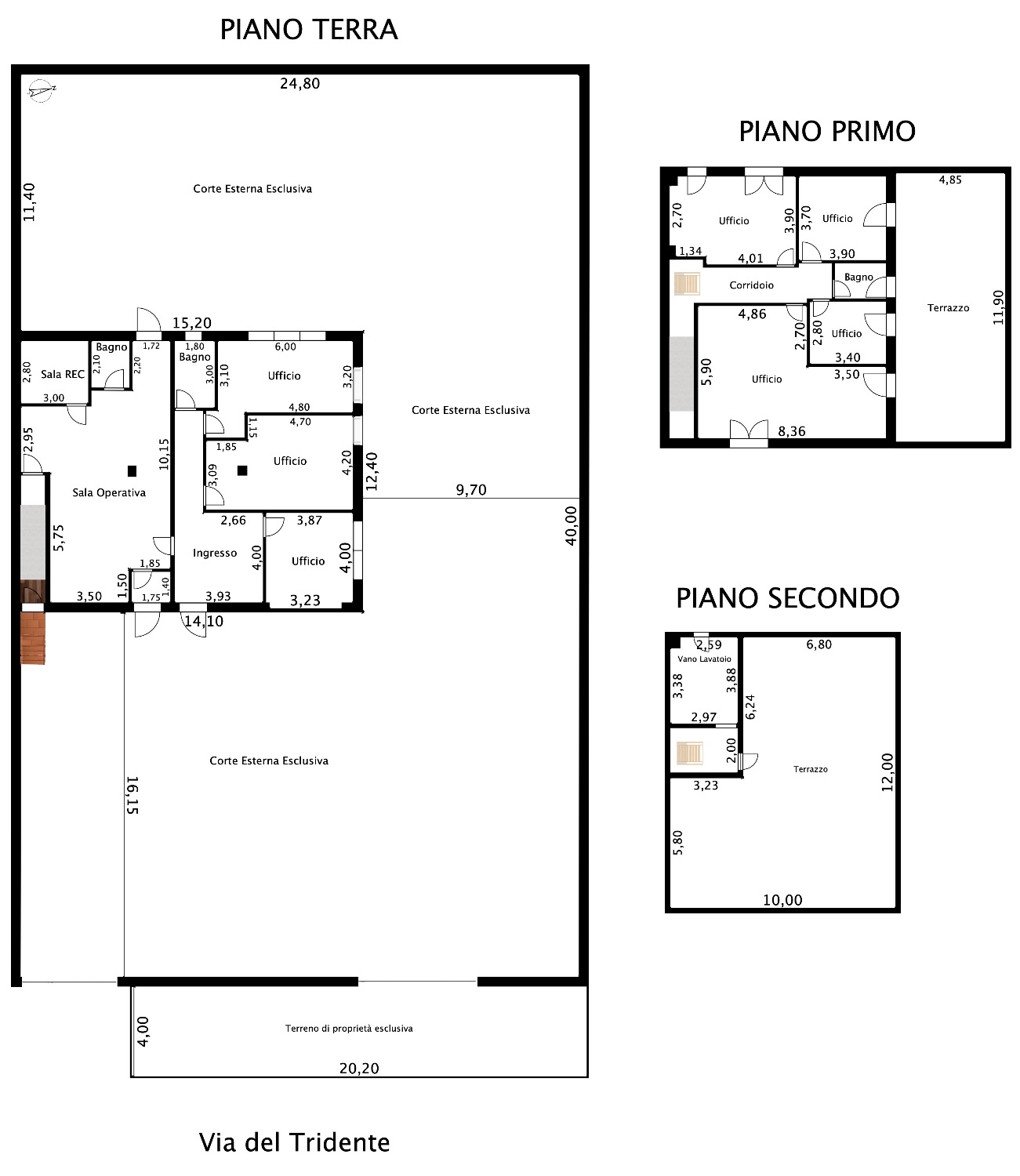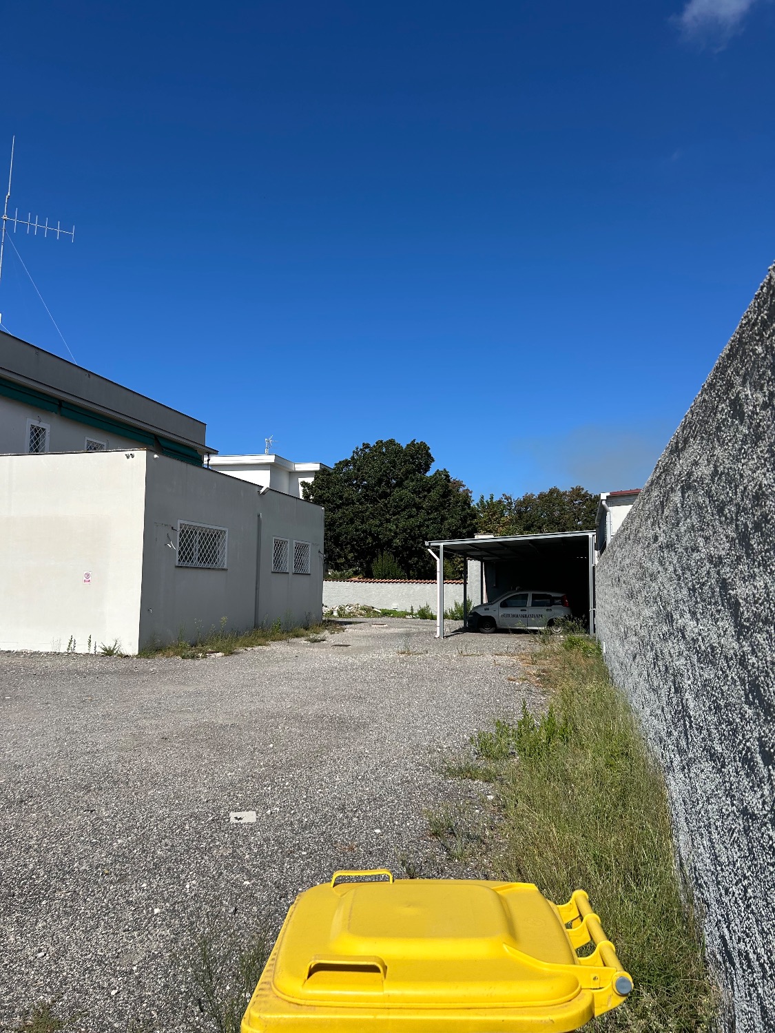 - Piano Terra: Ampio Piazzale esclusivo interno alla proprietà di circa 800Mq con 2 accessi carrabili (1 solo carrabile con cancello scorrevole motorizzato e 1 con cancelletto pedonale). Completa la proprietà anche il terreno fronte strada di 80Mq che attualmente è parte a verde (dove potrebbe essere istallata una insegna pubblicitaria) e una parte a cemento/asfalto (dove c’è l’accesso al cancello carrabile scorrevole motorizzato e la parte a cemento invece destinata a parcheggio per 2 posti auto. Il locale al suo interno, della dimensione di 190Mq totali, è composto da un ampio ingresso, 3 comodi uffici, un bagno, oltre ad una stanza di sicurezza blindata con al suo interno un bagno, una sala tecnologica ed un sottoscala. Il tutto è stato impostato e costruito dall’ultimo affittuario, che svolgendo un’attività di videosorveglianza e vigilanza, aveva necessità di una camera di sicurezza blindata dove al suo interno c’era una sala controllo con monitor e centralino oltre ad una sala registrazioni. Presenti nella stanza di sicurezza 2 condizionatori caldo/freddo.