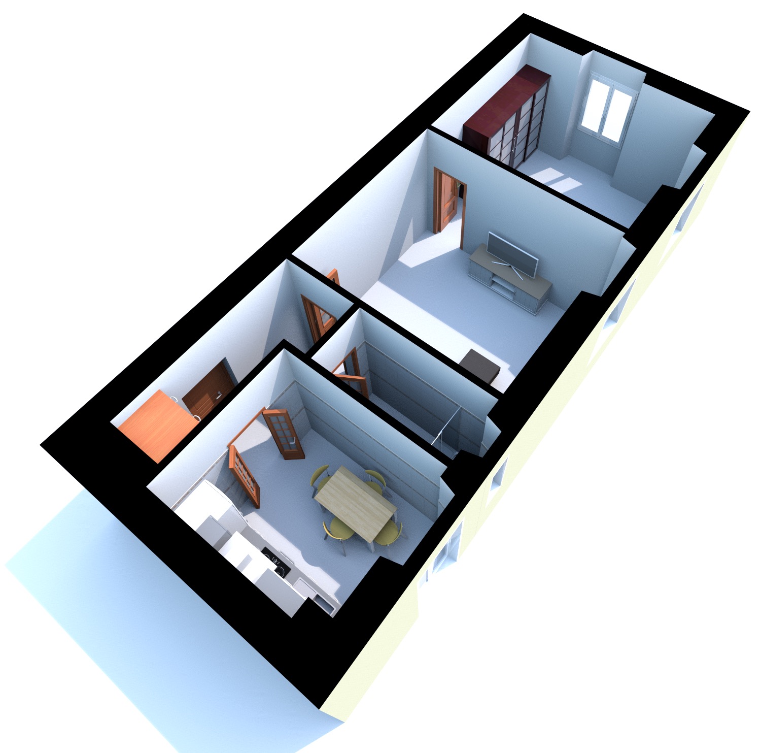 Proseguendo si entra nella stanza soggiorno/sala da pranzo dalla quale si accede alla Camera da Letto Matrimoniale con doppia finestra.