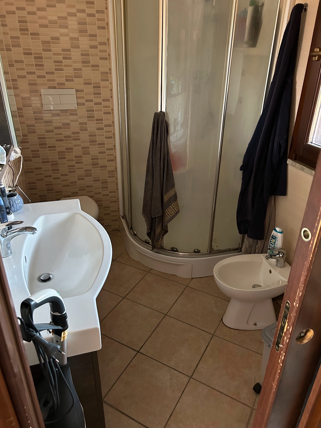 Dalla cucina si accede ad un disimpegno con nicchia armadio a muro/alloggio asciugatrice e bagno di servizio con porta scorrevole, dotato di Lavandino, WC, Bidet e Doccia, con finestra.