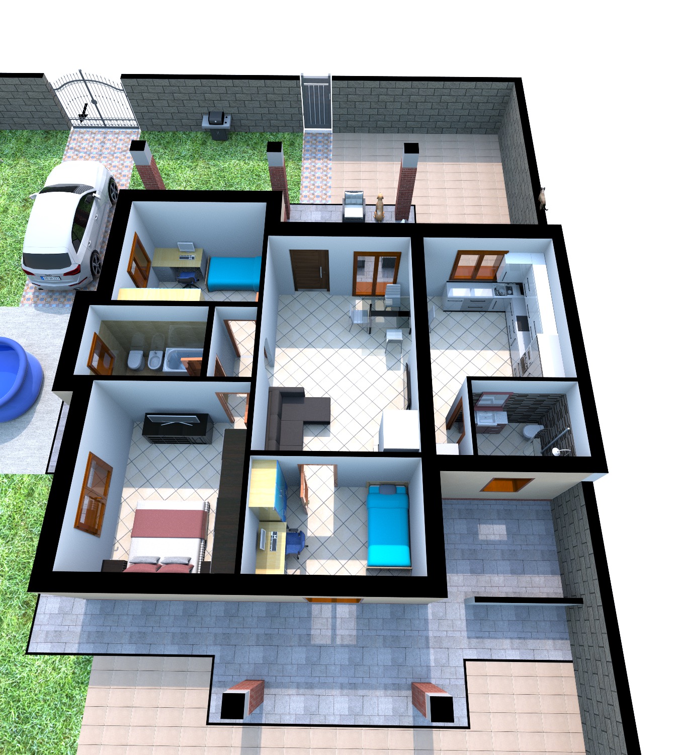 Completa la proprietà un ampio giardino angolare di 285Mq circa. Parte pavimentato da costruzione per il camminamento intorno casa, per le verande e per l’accesso carrabile e pedonale. L’attuale proprietà ha inoltre pavimentato, sia davanti che dietro, parte del giardino.