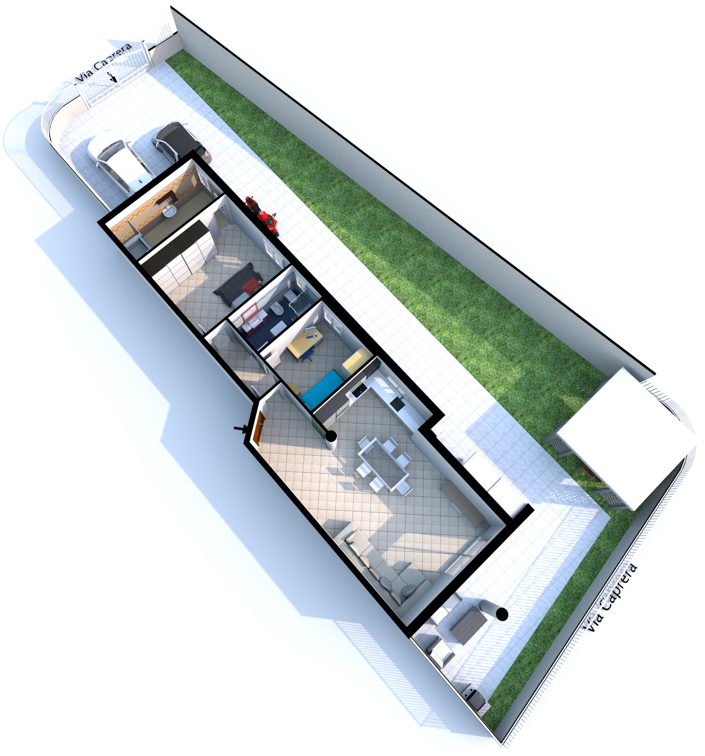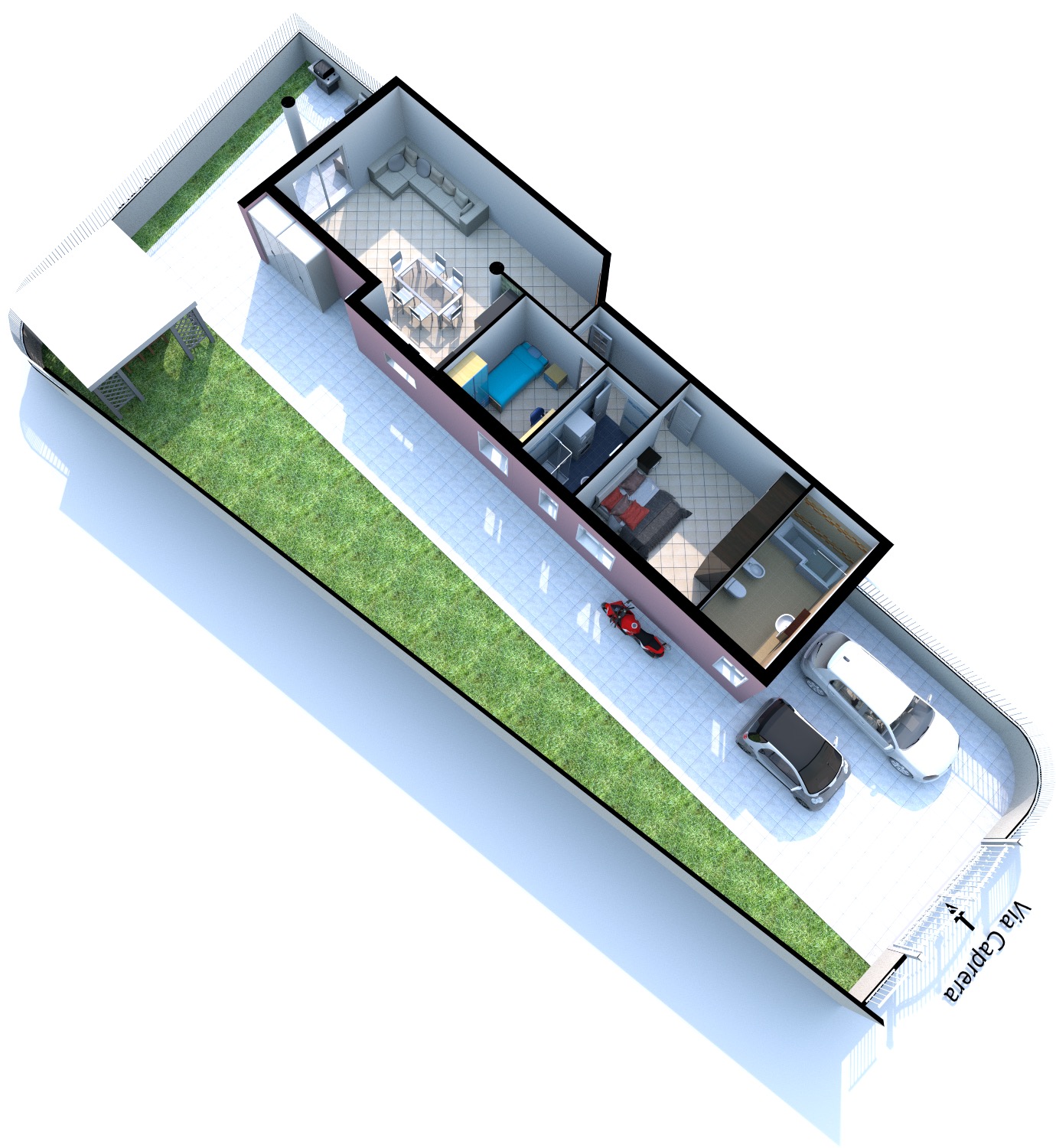 Esternamente il giardino di 190Mq circa è in parte pavimentato (per una superficie di 110Mq circa) e in parte a verde.